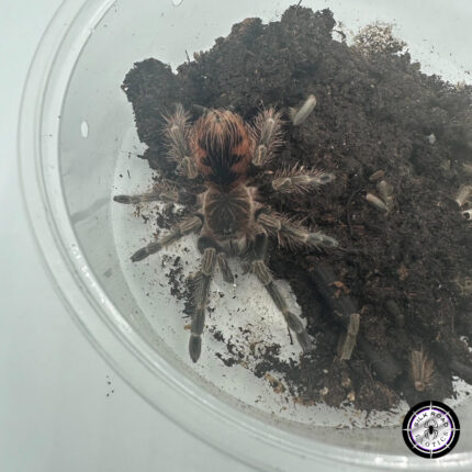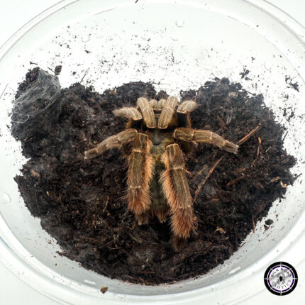 If you are looking for a “Master Excavator,” the Stripe Knee is unmatched. Unlike many terrestrials that simply sit on top of the dirt, A. seemanni is a relentless burrower that will spend its nights redecorating its enclosure and creating deep, silk-lined tunnels. They are famous for their unique “Blue Morph” variations, which can show a stunning metallic teal sheen on the underside of their legs and around their carapace after a fresh molt.